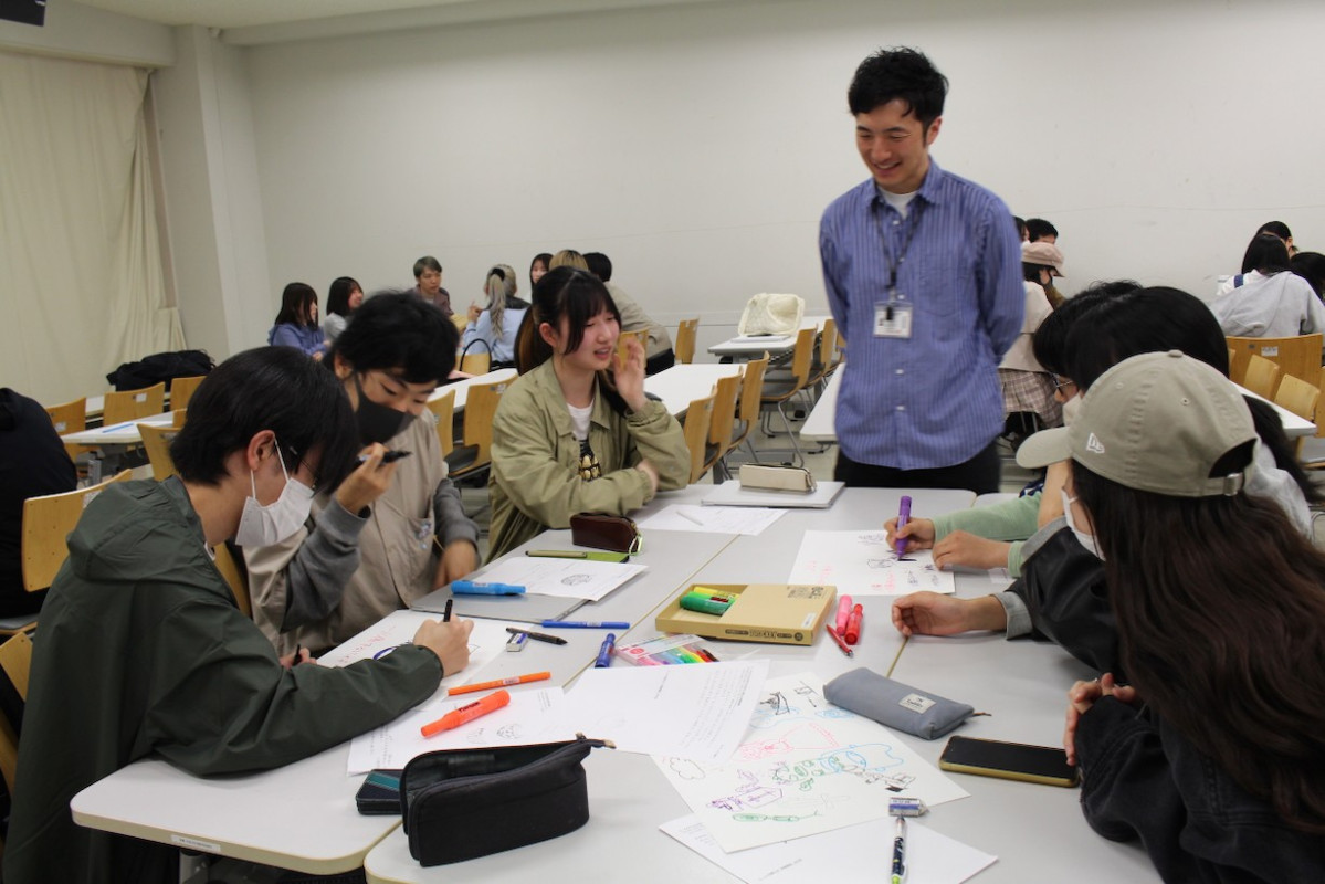 大学では1年生向けに「伝わるコミュニケーション」をテーマに授業を担当。学生は会議の内容を絵で整理する「グラフィックレコーディング」に取り組み、地域との協働やグループワークを通して社会で必要な対話力を磨いています。