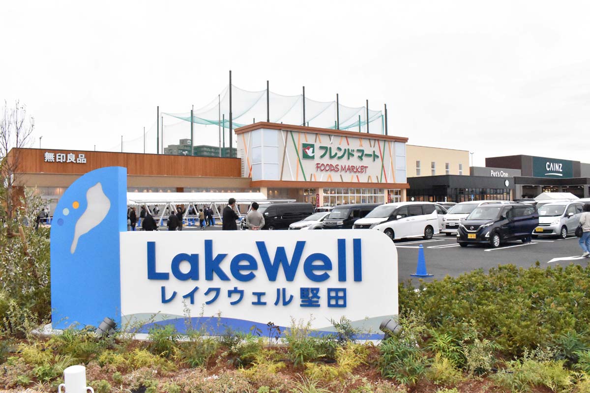 「フレンドマート今堅田店」「無印良品 堅田店品」「スターバックス コーヒー 大津今堅田店」「カインズ堅田店」が並ぶ商業施設「レイクウェル堅田」