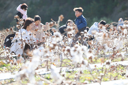 宮城県東松島市の赤坂農園で、綿花の収穫体験が行われた。東日本大震災で被災した農家を支援する「東北コットンプロジェクト」の一環。参加者は白いふわふわな綿毛の感触を楽しみながら丁寧に摘み取っていた=22日 【時事通信社】
