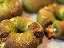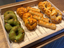 オープン時はカウンター上の木箱にベーグルを並べる