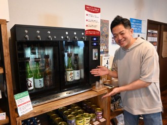 店内に日本酒専用サーバーを16タップ設置。滋賀県酒造組合に登録されている30蔵のうち、入荷に合わせて入れ替える16蔵の酒を立ち飲みスタイルで提供する。浪乃音酒造や平井酒造など大津市内の酒蔵のほか、冨田酒造(長浜市)など県内の日本酒をそろえる。1杯40ミリリットルで350円、3杯を選べる飲み比べセットは1,000円。