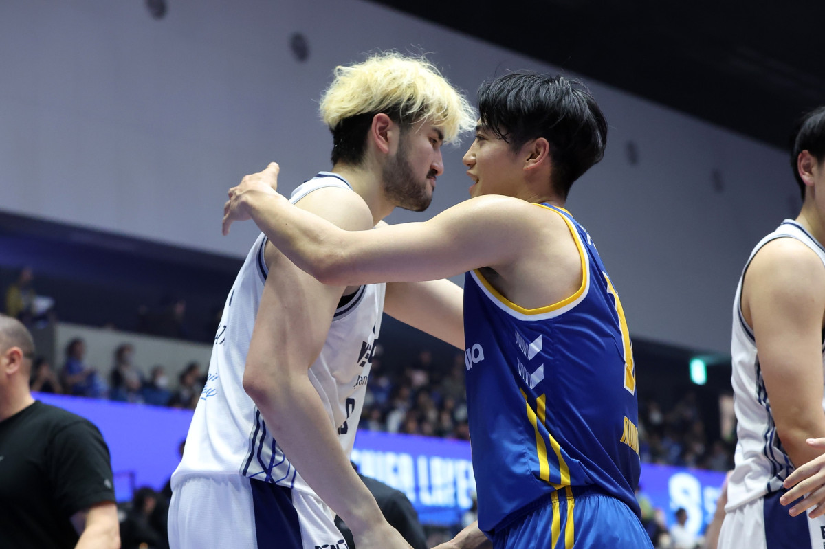 試合後のあいさつをする川真田紘也選手と野本選手©B.LEAGUE