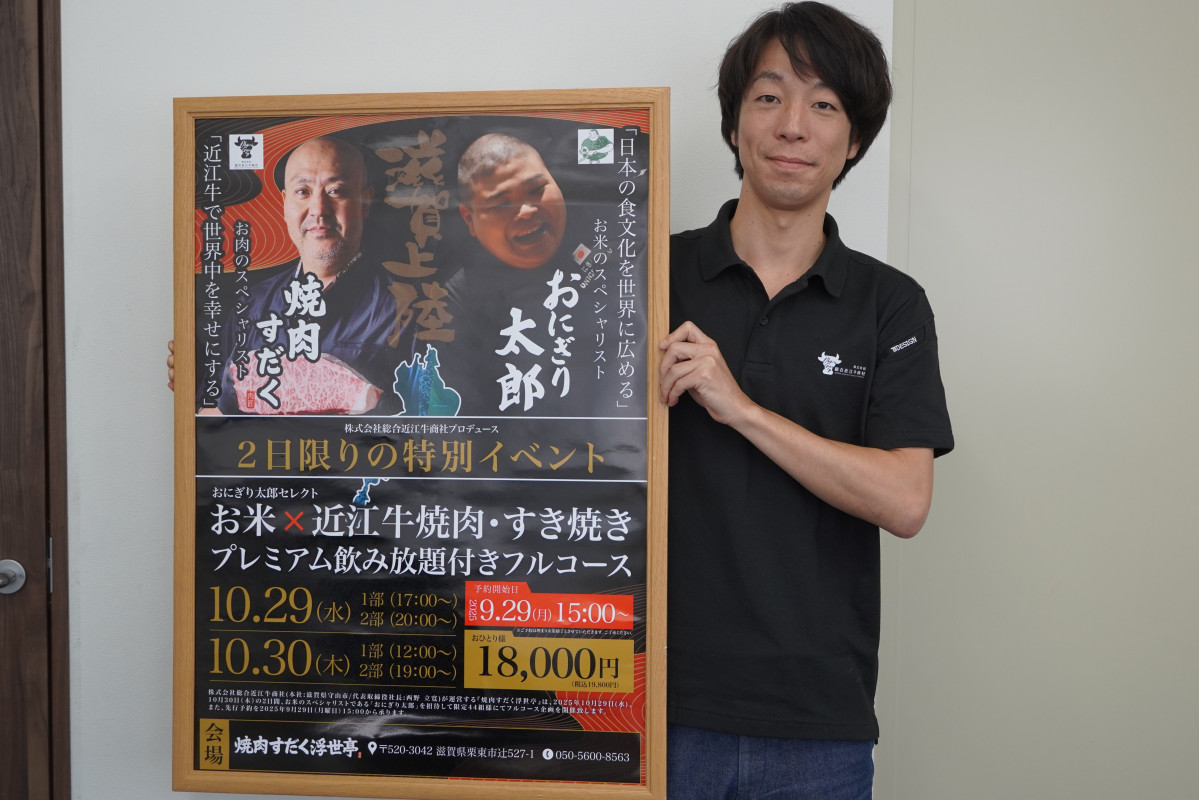 「おにぎり太郎」が握るおにぎりと近江牛焼き肉、すき焼きのフルコースを提供するイベントが10月29日・30日、完全個室焼肉すだく浮世亭(栗東市辻)で開催される。