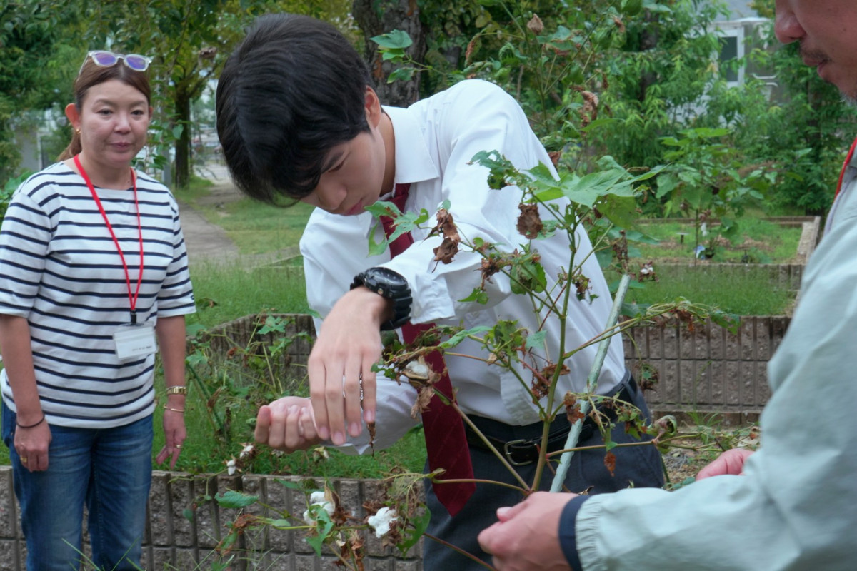 立命館守山中学・高校の敷地内で栽培した綿花を収穫する生徒