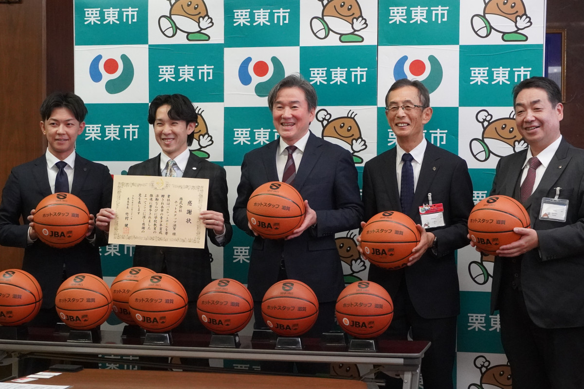 Bリーグの滋賀レイクスが12月22日、ホットスタッフ滋賀(栗東市手原5)の協賛を受けて、栗東市内の公立小・中学校にバスケットボール75球を寄贈した。