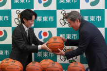 Bリーグの滋賀レイクスが12月22日、ホットスタッフ滋賀(栗東市手原5)の協賛を受けて、栗東市内の公立小・中学校にバスケットボール75球を寄贈した。