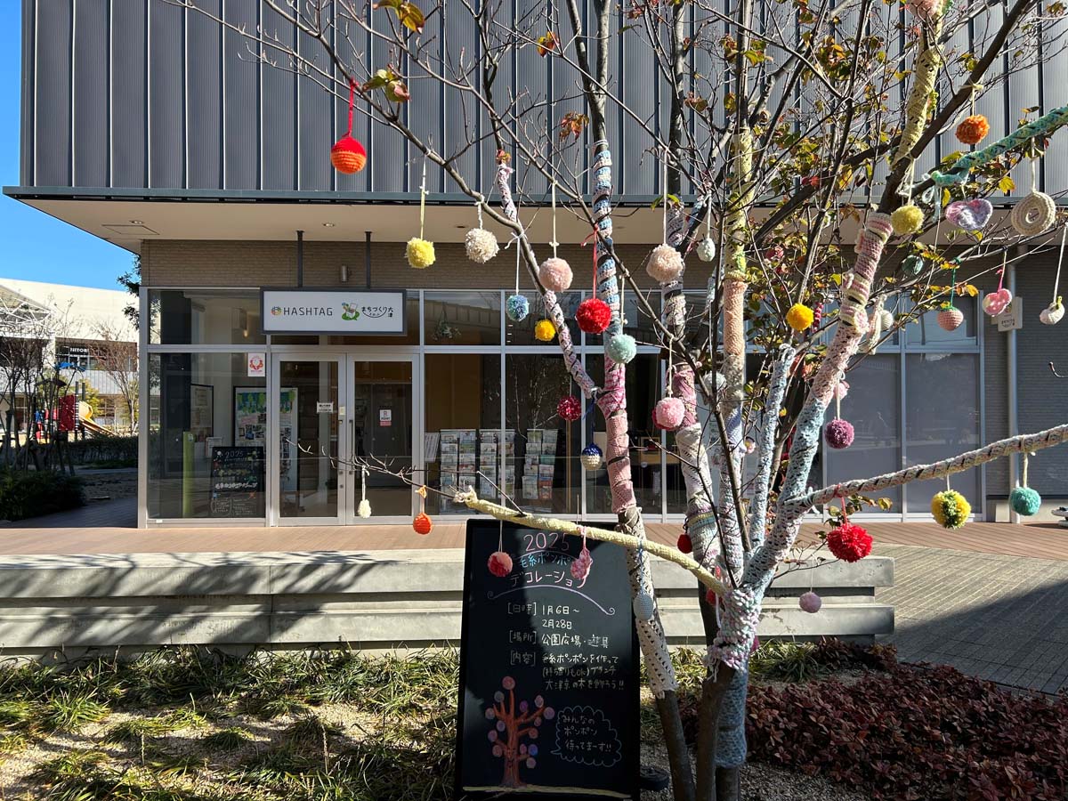 樹木を毛糸で装飾する「ヤーンボミング」が2月1日、ブランチ大津京(大津市二本松)で始まる。