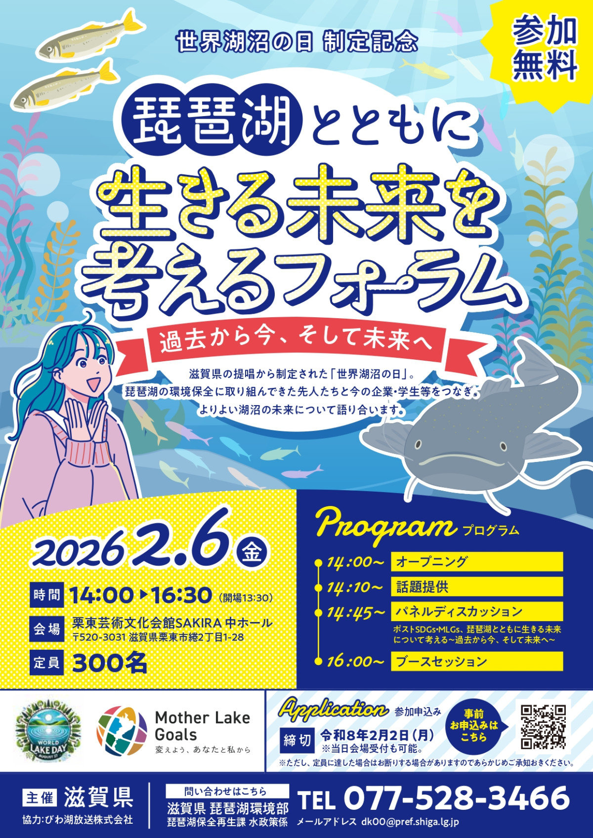 世界湖沼の日制定記念イベント「琵琶湖とともに生きる未来を考えるフォーラム~過去から今、そして未来へ~」が2月6日、栗東芸術文化会館SAKIRA(さきら、栗東市綣2)で開催される。