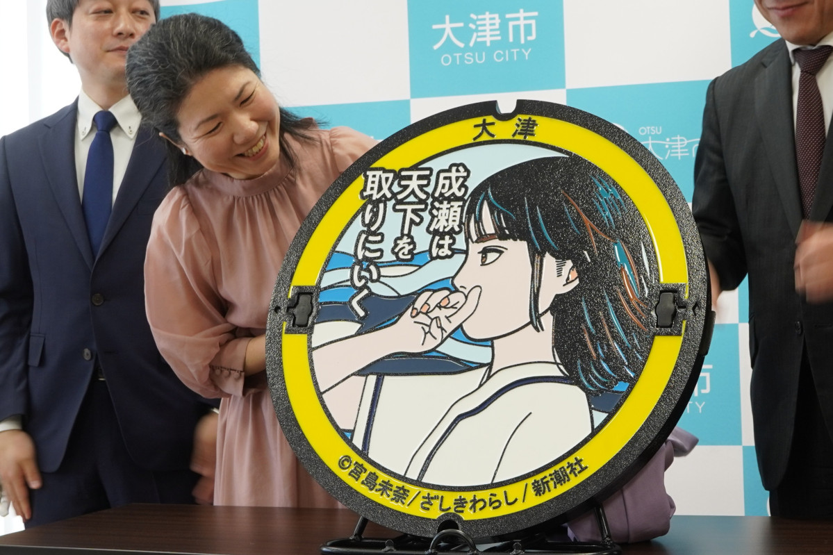 大津市膳所が舞台の小説「成瀬は天下を取りにいく」の特別デザインマンホールふたが1月19日、京阪膳所駅改札前に設置された。