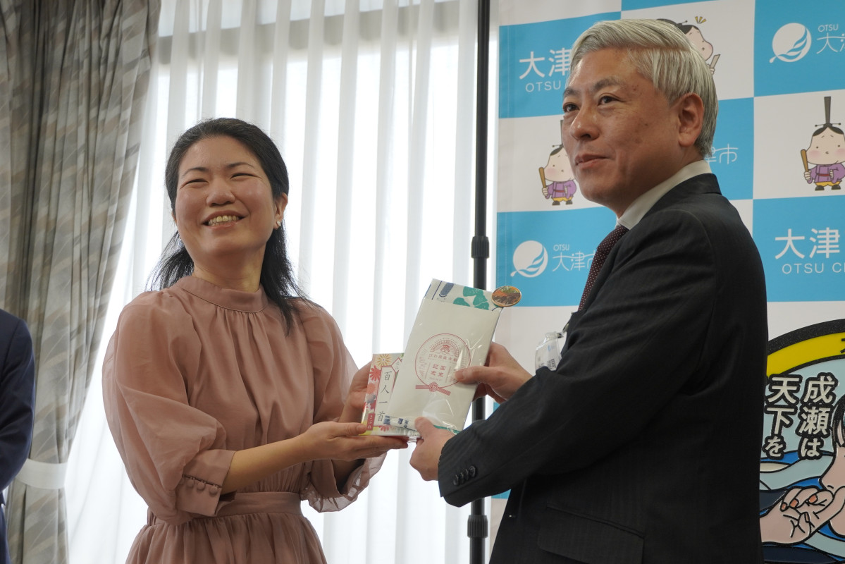 大津市膳所が舞台の小説「成瀬は天下を取りにいく」の特別デザインマンホールふたが1月19日、京阪膳所駅改札前に設置された。