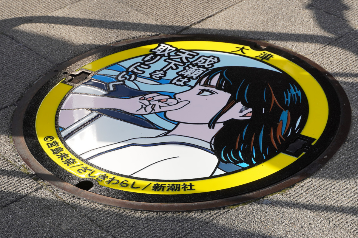 膳所駅前に設置された「成瀬は天下を取りにいく」マンホールふた