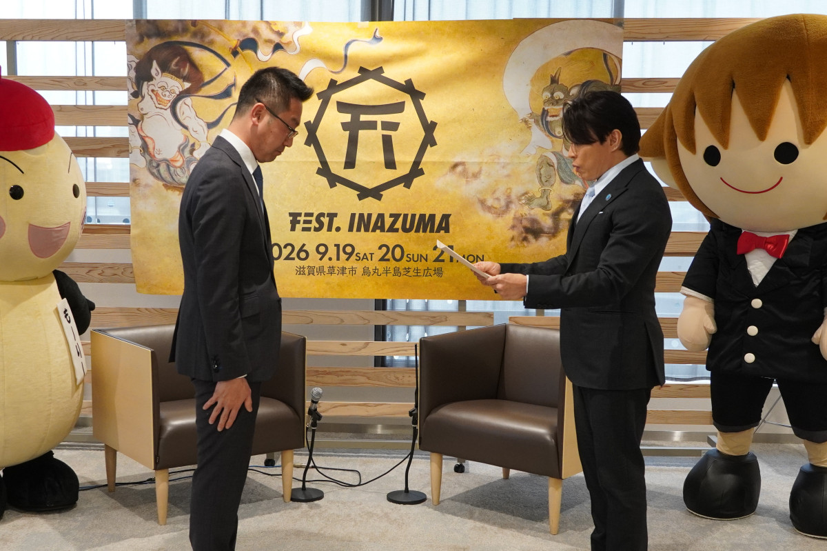 滋賀ふるさと観光大使を務めるアーティストの西川貴教さんが2月2日、「イナズマロックフェス2025」の収益の一部、50万円を守山市に寄付した。