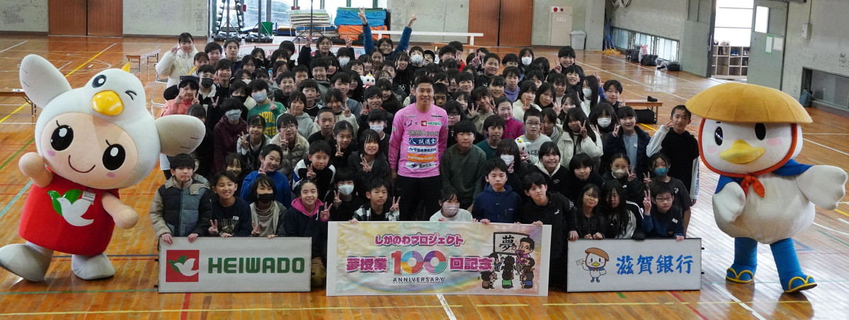 元Jリーガーの村田和哉さんによる「しがのわプロジェクト」の夢授業が2月10日、志賀小学校(大津市南志賀1)で開かれ、通算100回目を迎えた。
