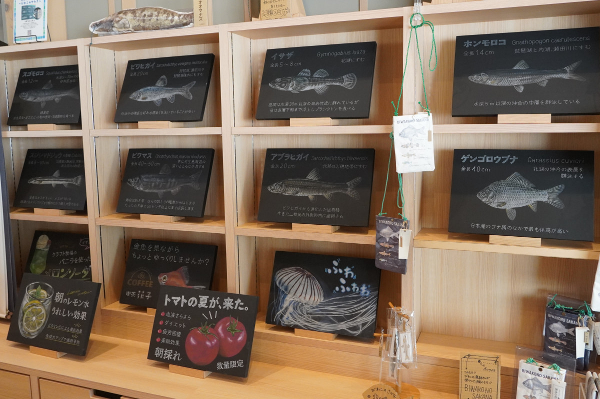ビワマス、ビワヒガイなど琵琶湖の魚を描いた黒板アート作品