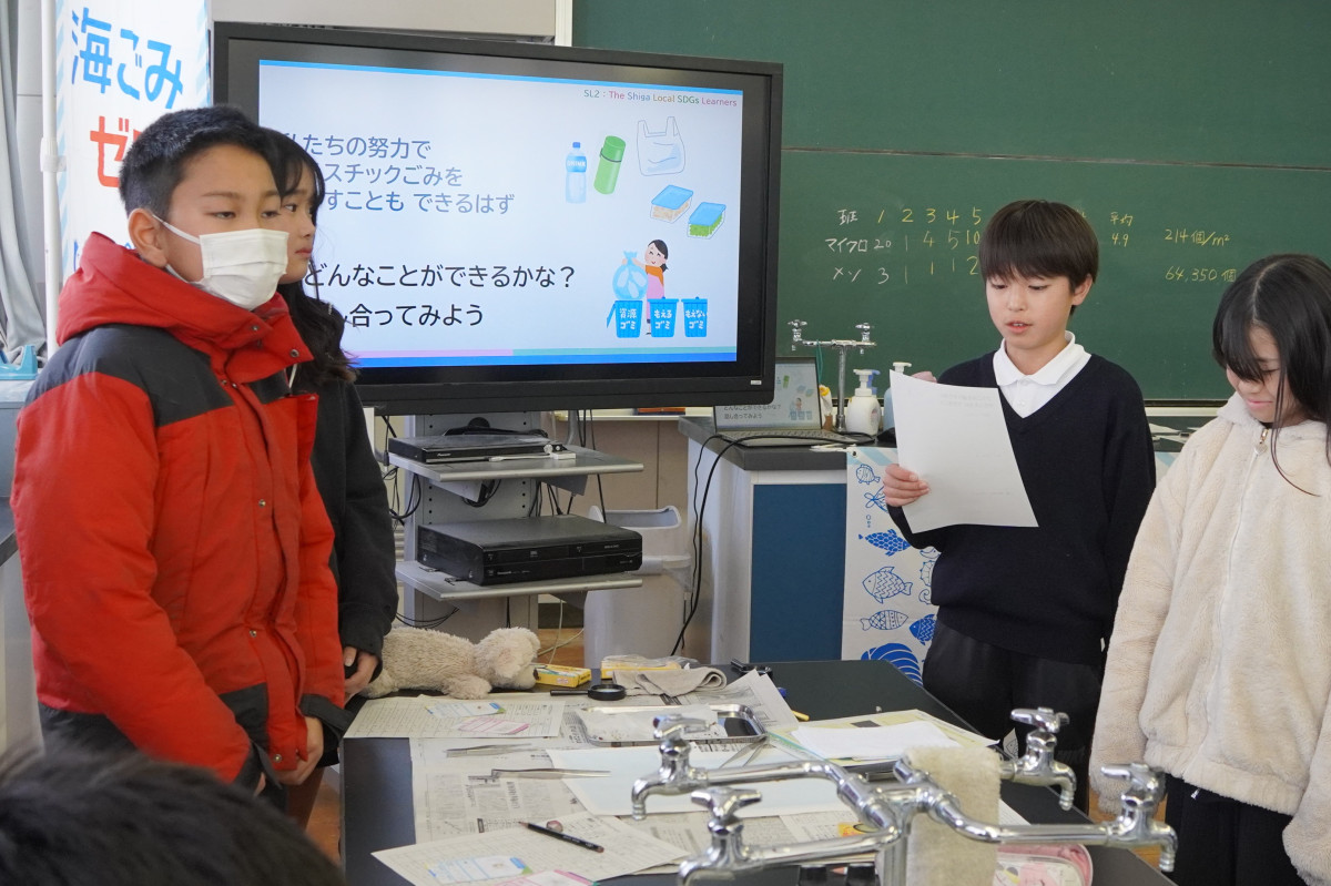 マイクロプラスチックを減らすために何ができるか発表する児童