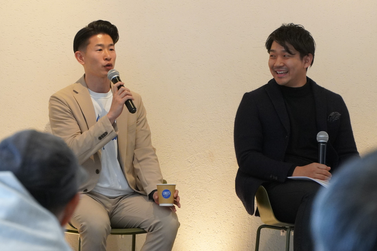 滋賀レイクスの原社長(左)と&SPORTSの王社長