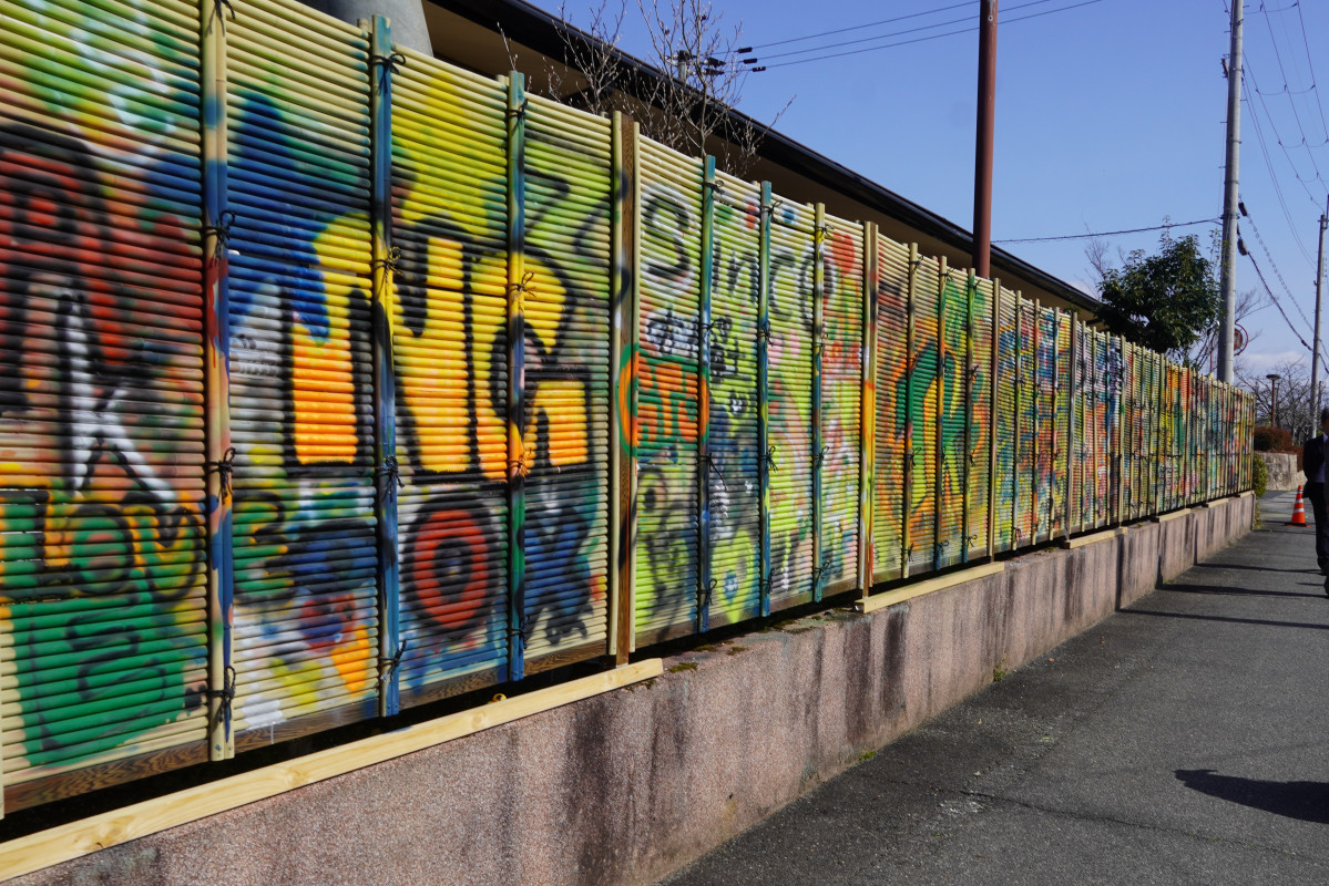 塀には高校生や小中学生、高齢者らが「思い」を描いた
