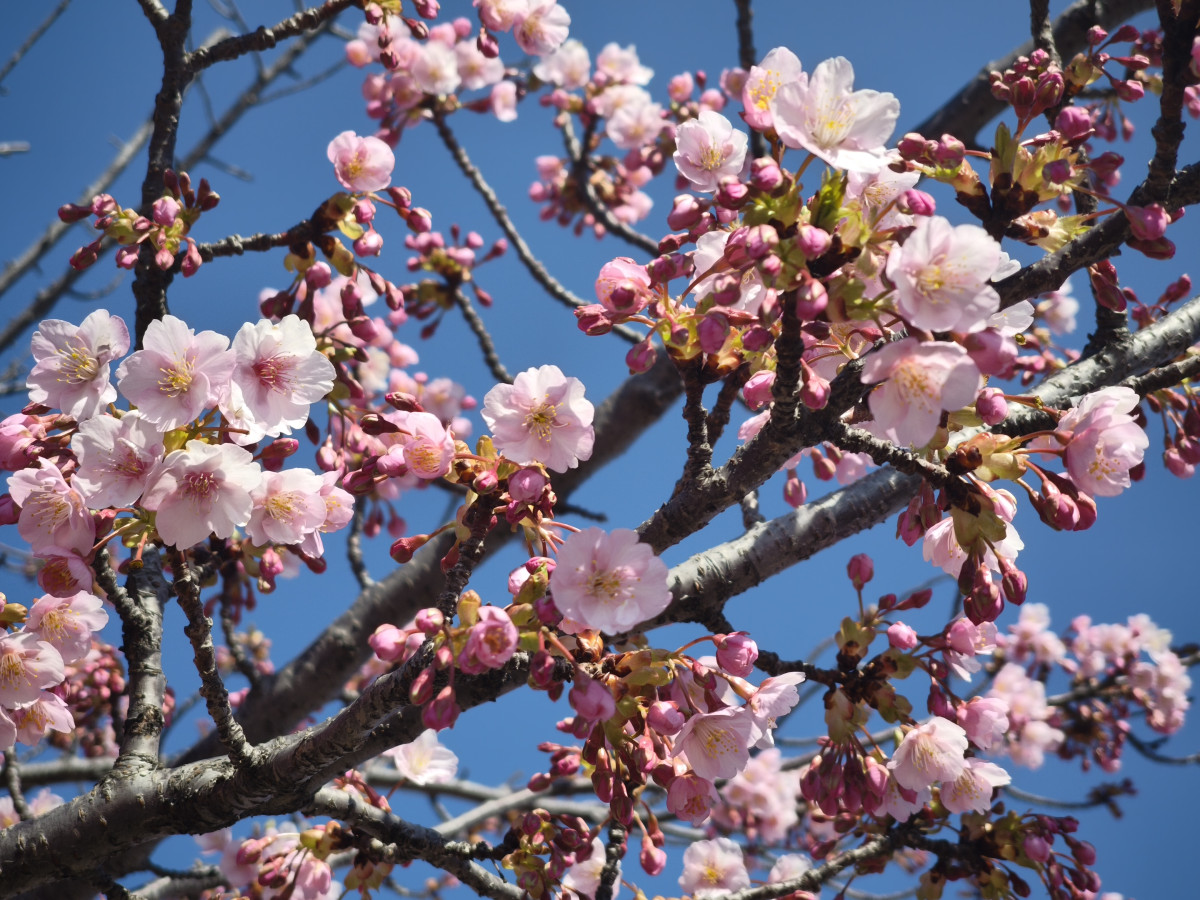 大津湖岸なぎさ公園サンシャインビーチ(大津市由美浜1)で河津桜が咲き始め、現在、琵琶湖岸に一足早い春の訪れを告げている。