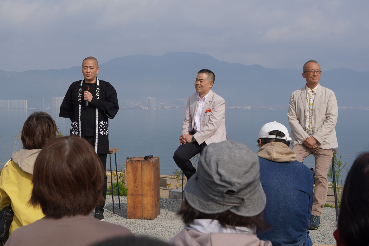 三日月大造知事、今森光彦さん、たねやグループ社長の山本昌仁さんによる鼎談