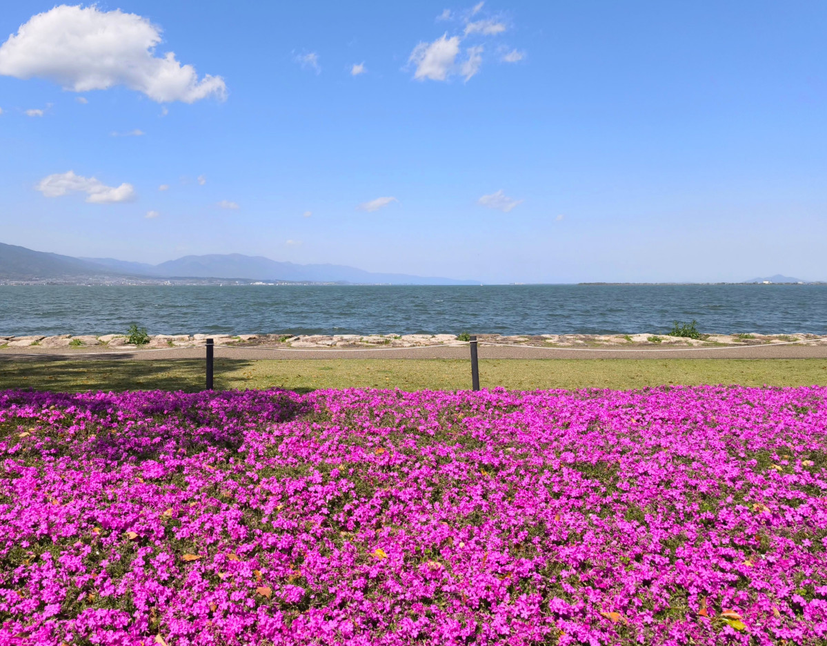 大津湖岸なぎさ公園なぎさのプロムナード(大津市におの浜4)で現在、シバザクラが見頃を迎えている。