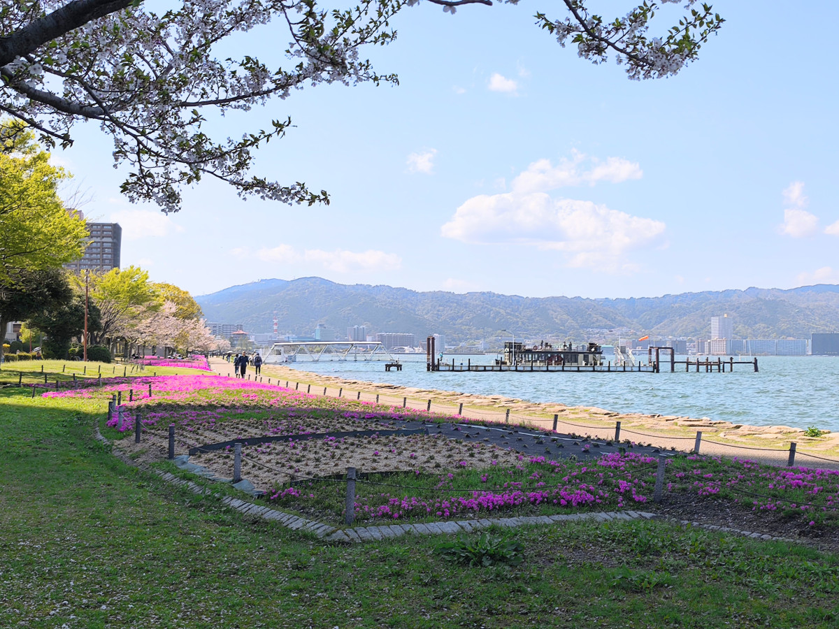 大津湖岸なぎさ公園なぎさのプロムナード(大津市におの浜4)で現在、シバザクラが見頃を迎えている。