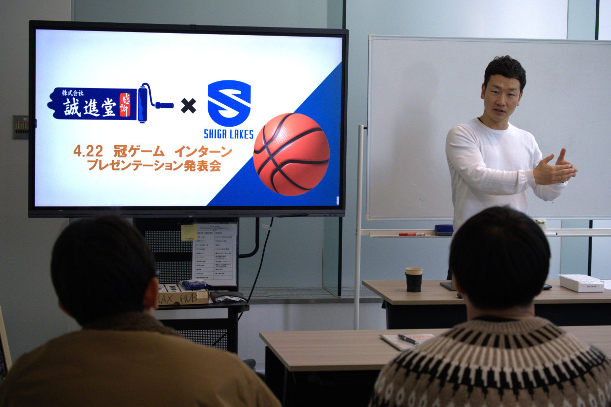 外壁・屋根塗装などの住宅リフォーム事業を手がける誠進堂(大津市梅林1)が4月22日、滋賀レイクスの試合会場で新入社員によるブースを出展した。