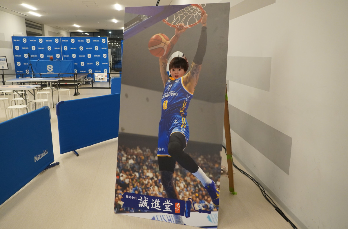 外壁・屋根塗装などの住宅リフォーム事業を手がける誠進堂(大津市梅林1)が4月22日、滋賀レイクスの試合会場で新入社員によるブースを出展した。