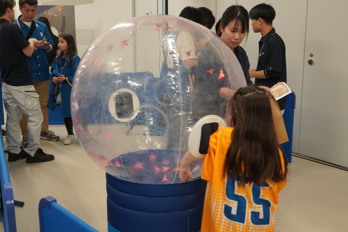 外壁・屋根塗装などの住宅リフォーム事業を手がける誠進堂(大津市梅林1)が4月22日、滋賀レイクスの試合会場で新入社員によるブースを出展した。