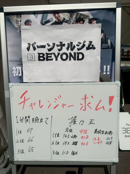 約1,500名が訪れた会場では、BEYONDブースにも多くの来場者が集まり、握力測定や体組成測定、腕立て伏せ対決などを通して“スポーツの楽しさ”や“健康づくりの大切さ”を体感していただきました。
