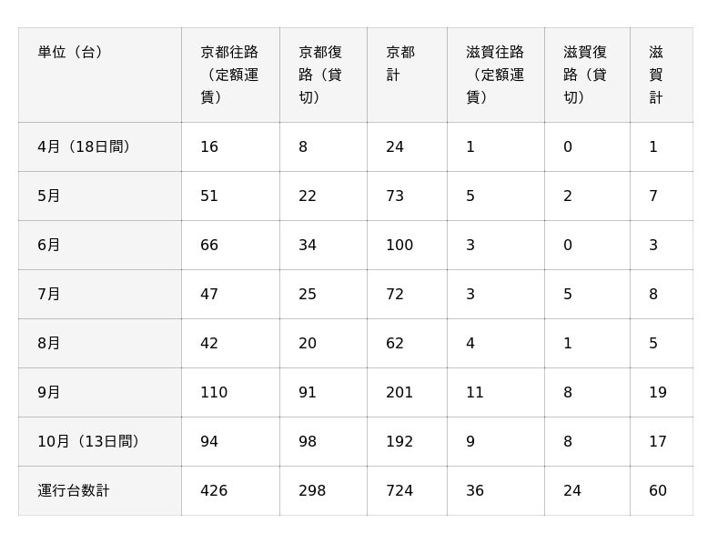 万博が始まった4月(18日間)は京都で往路の定額利用が16台、復路の貸切利用が8台の合計24台。滋賀では往路1台でしたが、会期が進むにつれて来場者が増え、10月(13日間)で京都で往路の定額利用が94台、復路の貸切利用が98台の合計192台。滋賀では往路の貸切利用が往路の定額利用が9台、復路の貸切利用が8台の合計17台でした。最終で京都滋賀あわせると往復合わせて784台、運行した184日間で一日当たり4.3台でした。