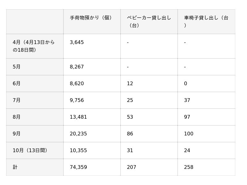 万博会期中の手荷物預かりは合計74,359個の預入れ、ベビーカー貸し出しは207台、車椅子貸し出しは258台ありました。手荷物預かりは万博へ行く方が利用するだけでなく大阪市内のコンサート会場で著名なアーティストのコンサートがあると利用が大きく増えました。4月と10月を比較して一日当たりの手荷物預かりの個数は4倍に増えました。