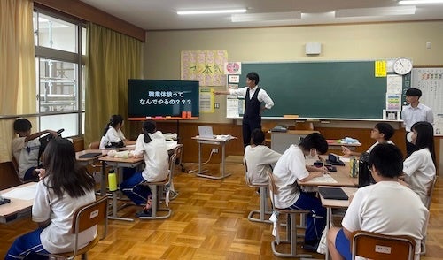 当日は「働く上での心がまえ」や「社会人としてのマナー(あいさつ・返事、服装チェック、電話でのアポどり等)」について、実演を交えながら解説し、生徒たちが職場体験をより実りあるものにできるよう支援いたしました。