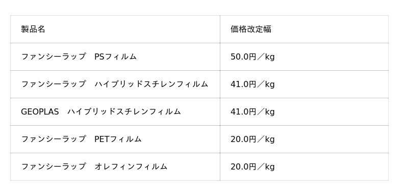 つきましては、お客様への安定供給の責任を果たすため、熱収縮フィルム製品の価格改定を行うことといたしました。