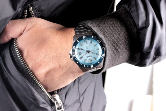 見た目はあえて定番のダイバーズウォッチとした中にもデザイナーの個性とこだわりが詰まっています。スクエアのバーインデックスと対比するように時計の針はトライアングルにデザイン。古典的なクラシックデザインと洗礼されたモダンデザインを上手く融合しています。0.1mmの単位で細かく設計を行いジャストなカーブ感、サイズ感を作り上げました。