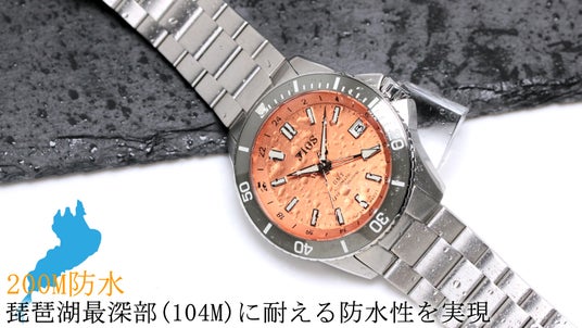そもそも性能としては200M防水であるのになぜ104なのか…。それは琵琶湖の最深部がおよそ104Mであり、その深度まで耐えうる防水性能であるダイバーズウォッチであることを表しているからです。世界中のお客様がこの「104」に疑問を持ち、その意味を知ることで滋賀県や琵琶湖、さらには大津石山について知ってもらい少しでも知名度が向上すればという気持ちを込めてモデル名をつけました。