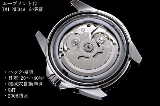 ムーブメント:機械式自動巻き(NH34)、ハック機能付き、日差:-20~+40秒、GMT搭載、ねじ込み式リューズ、サファイアカーブガラス、畜光:スーパールミノヴァ、防水性能:200M防水、スクリューバック、ステンレスベルト、製造国:日本(MADE IN JAPAN)