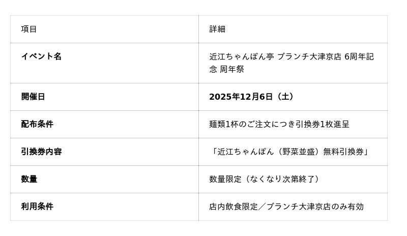 「近江ちゃんぽんをニッポンのちゃんぽんに!」 を掲げるドリームフーズ株式会社(本社:滋賀県彦根市/代表取締役社長:山本英柱)は、当社が運営する 「近江ちゃんぽん亭 ブランチ大津京店」 の開店6周年を記念し、地域の皆さまへの感謝を込めた 「6周年記念 周年祭」 を 2025年12月6日(土) に開催いたします。
