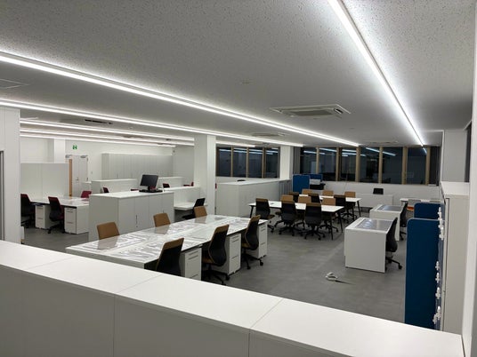 外壁の一部には、当社の新製品「DNT EXTRAアクア無機」を採用し、高い耐候性・耐久性により、施設の美観を長期間維持します。事務所棟の照明設備にはDNライティング(株)の製品を導入し、省エネルギーでありながら快適な執務環境を実現しました。また、倉庫内外の路面標示材(区画線等)には、蛍光色材事業を担うシンロイヒ(株)の蛍光塗料を使用することで、高い視認性と耐久性を確保し、安全性および作業効率の向上に寄与しています。