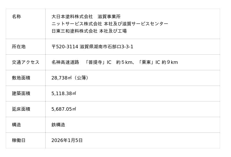 大日本塗料株式会社(本社:大阪市中央区、代表取締役社長:里 隆幸)は、滋賀県湖南市に新たな物流拠点を新設し、関西エリアで分散していた物流機能を集約しました。本拠点の新設により、関西エリアにおける拠点間輸送を削減するとともに、製造から保管、出荷までの作業の流れを整理し、安定供給を支える将来を見据えた物流体制の構築を進めます。