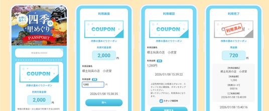 「四季の里めぐりパスポート」は、参加地域の店舗で使えるクーポンを活用し、観光客の購買や地域回遊を促進する観光キャンペーンです。クーポンは残高を複数回に分けて使えるため、観光地を巡りながら地域内での消費を促進できます。