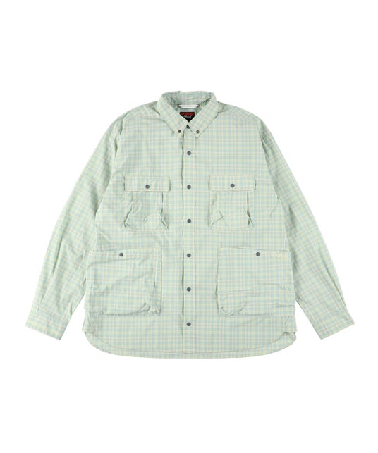 収納力たっぷりでアウトドアに重宝するキャンプシャツです。クラシックさも感じますが、シルエットは現代的でほどよくゆとりを持たせました。素材は軽量で速乾、洗濯もしやすいポリエステル素材。不規則で奥行きのあるチェック柄がアクセントを与えてくれます。