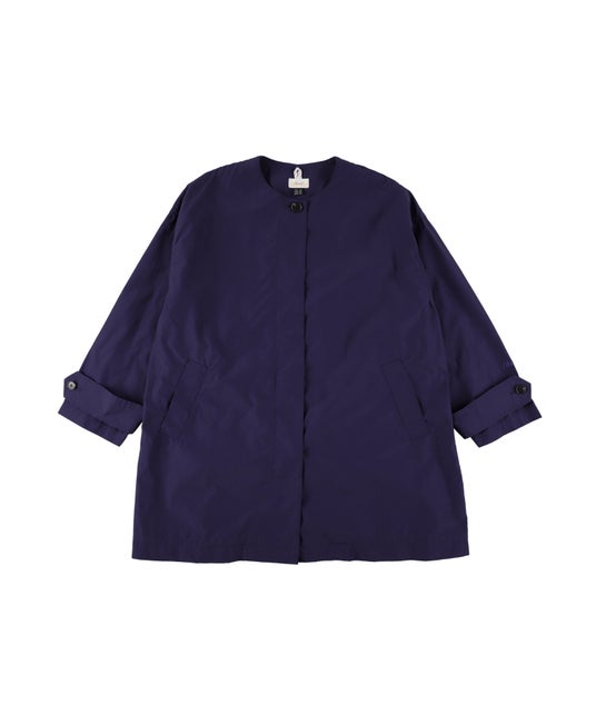 通気性と肌触りを兼ね備えた、コットン×ナイロンのポプリン生地を使用したノーカラーコートです。横畝のある平織り生地は、なめらかで上品な光沢感。ミニマムなデザインが、生地のドレープの美しさを引き立て、きれいめにもカジュアルにも馴染みます。