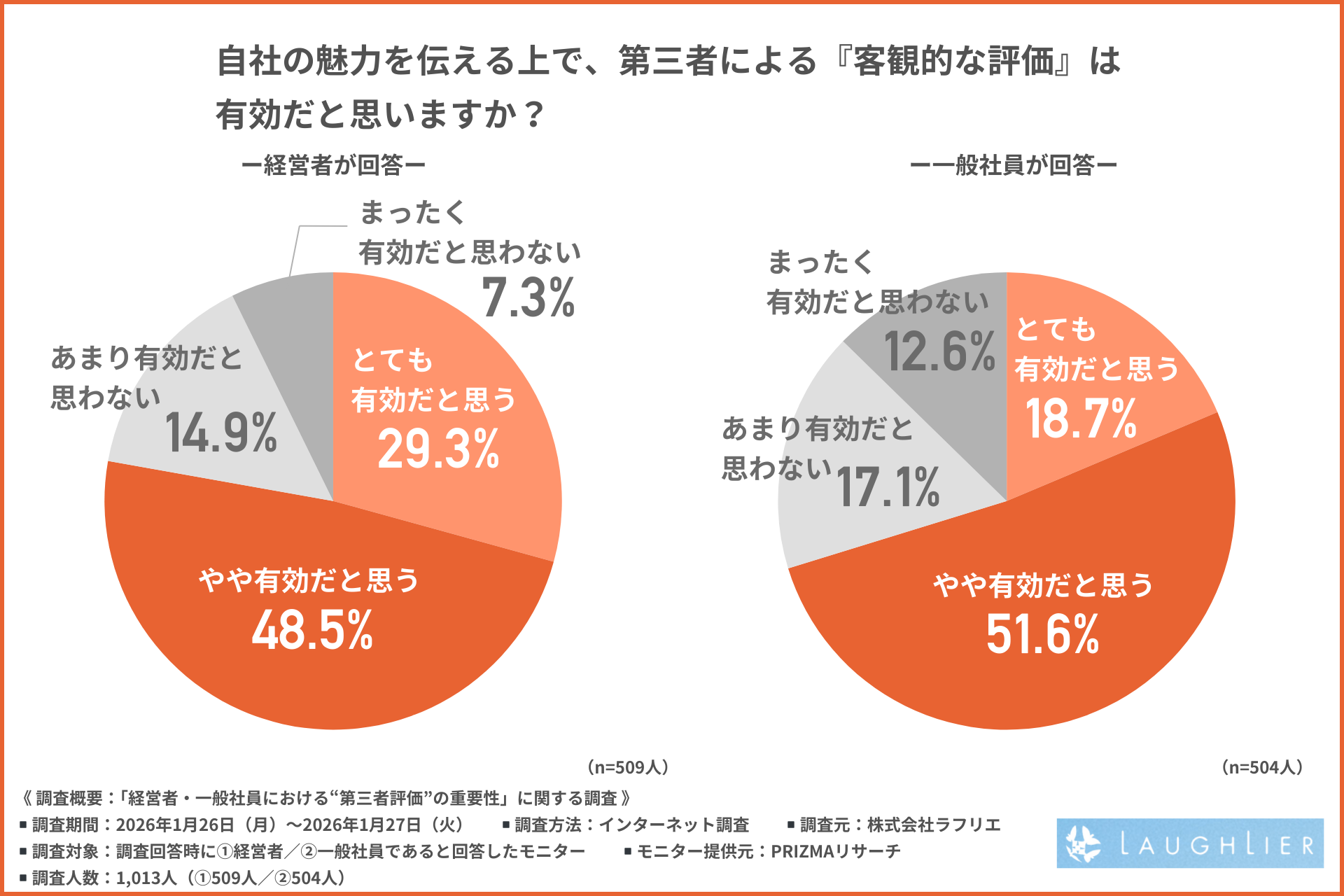 そこで今回、株式会社ラフリエ(https://www.laugh-lier.co.jp/)は、1.経営者/2.一般社員を対象に、「経営者・一般社員における“第三者評価”の重要性」に関する調査を行いました。