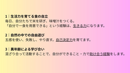 預かり自然体験diveの長期休み居場所プログラムは、以下の3つの特徴があり、ただ”預かる”ではない自分で決めて自分で取り組む時間を過ごすことにより、遊びながら子どもたちが育ちます。