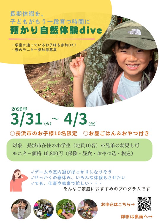株式会社dive in LIFE(本社:滋賀県長浜市)は、2026年春休みに滋賀県長浜市で「預かり自然体験dive:長期休み居場所プログラム」を実施します。本取り組みは、こども家庭庁が推進する放課後児童健全育成事業の理念を、地域民間の立場から実装する挑戦です。