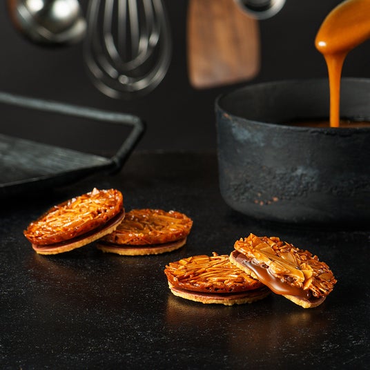 香ばしく華やかな甘さのアーモンドフロランタンとバターサブレで、とろけるキャラメルをサンドした「キャラマーサンド」。薄く焼き上げたバターサブレにはチョコレートをまとわせています。芳醇なバターと香ばしいアーモンド、そしてとろけるキャラメルとチョコレート、素材そのものの風味を感じていただける当店を代表するフレーバーです。
