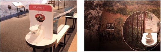 シジミ汁(左)、マツタケ入りすき焼き(右)の「におい体験」展示(B展示室)
