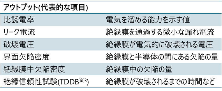 ※3 TDDB(Time Dependent Dielectric Breakdown、経時絶縁破壊):一定電圧下で絶縁膜が破壊されるまでの時間を多数回測定し、その結果を統計処理することで、絶縁膜の耐久性および長期信頼性を評価する試験。