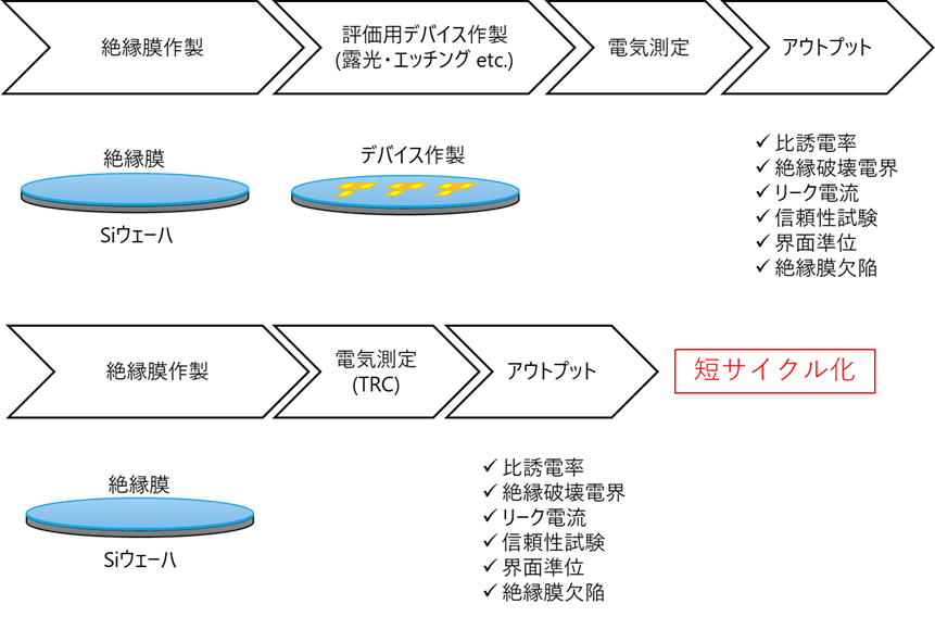 図1 絶縁膜の電気特性評価の流れ:上段 従来評価プロセス、下段 新規評価プロセス