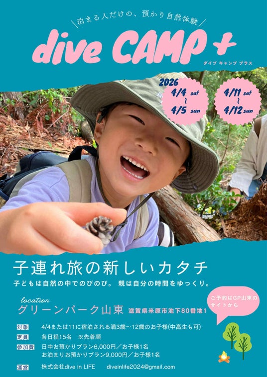 2022年のサービス開始以来、滋賀県を中心に延べ1000人以上の子どもが参加してきた自然体験を行う株式会社 dive in LIFE(本社:滋賀県長浜市、代表:熊谷理美)は、2026年4月、米原市のキャンプ場「グリーンパーク山東」にて、宿泊者限定のキッズ預かりプログラム「dive CAMP+(ダイブ キャンプ プラス)」を開催いたします。